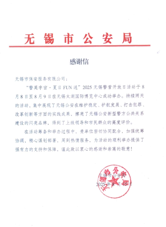 熱情服務(wù),彰顯擔(dān)當(dāng) ——公司獲無(wú)錫市公安局感謝信